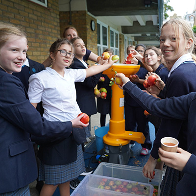 Following a fabulous apple-tastic lunch courtesy of our wonderful catering team, girls and staff gathered in the playground and enthusiastically got stuck into washing, pressing and juicing! The fruits of their labour were over 100 litres of a delicious and truly inimitable FHS apple juice which pupils and staff were delighted to call their own.
